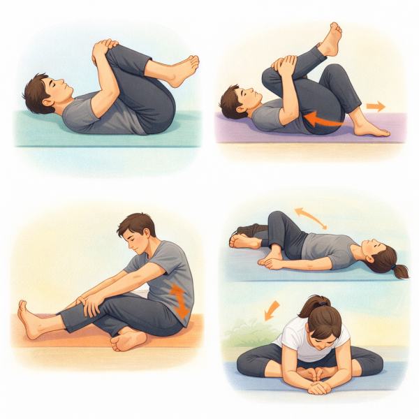 仰向けに寝て両膝を抱え、ゆっくり胸に引き寄せます。10〜20秒を目安に2〜3回行い、息を止めないようにするのがポイントです。腰まわりの緊張をやわらげる方法として知られていると言われています。