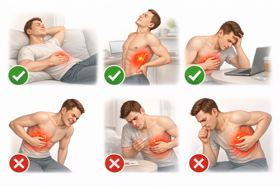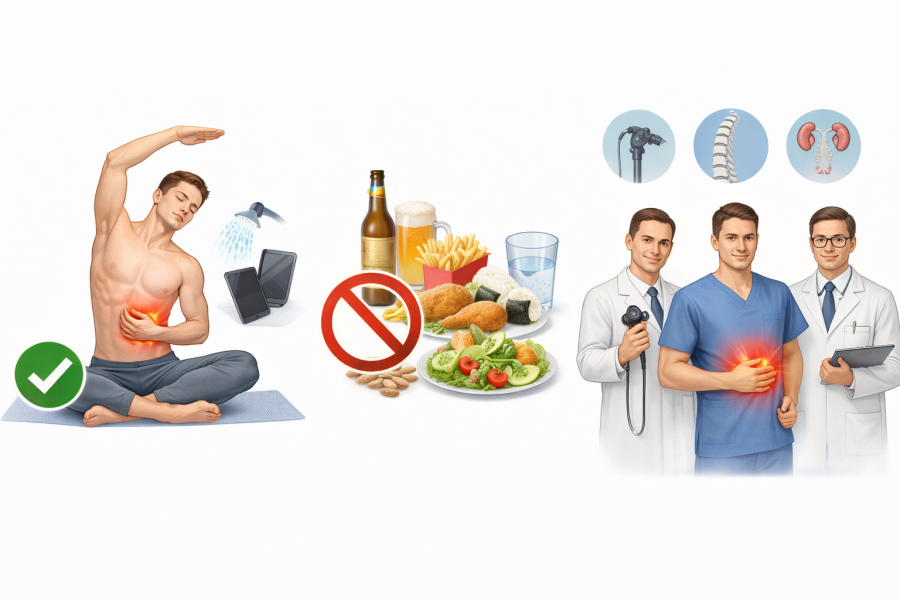 右のあばらの下や右上腹部に痛みを感じたとき、「自分でできる対処はあるのか」「いつ来院すればよいのか」と迷う方も多いのではないでしょうか。実際には、痛みの原因によって対応の考え方が変わると言われています。