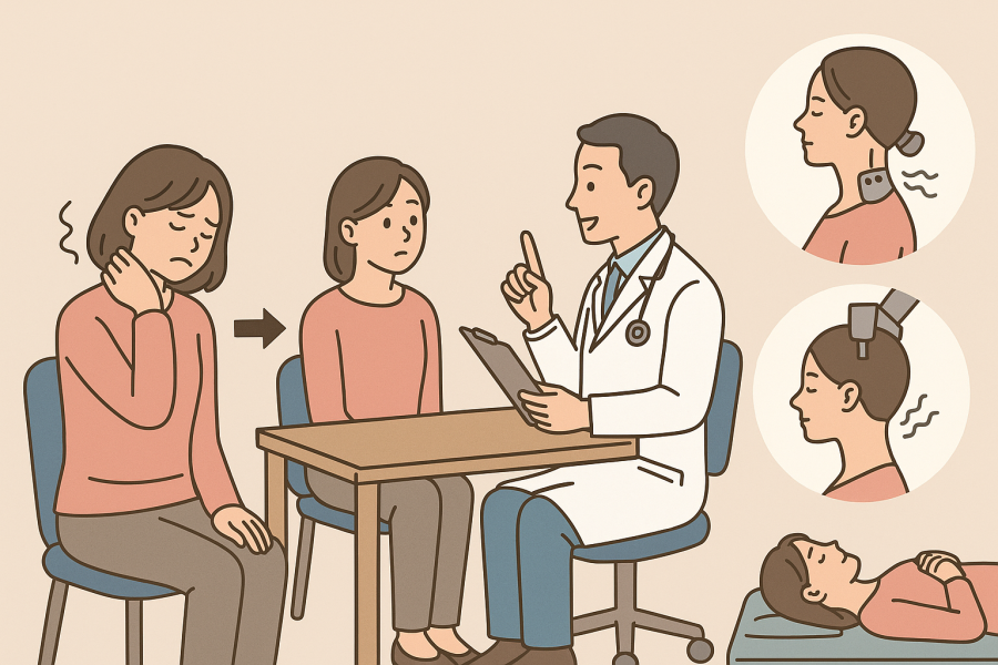 専門機関では、まず問診や触診、必要に応じてレントゲンやMRIなどで首の構造や神経の状態を確認することがあります。その結果に応じて、さまざまな検査・施術法が選択されます。