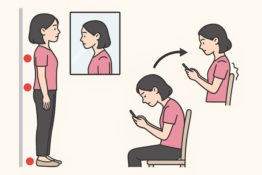 - 鏡や壁を使った姿勢チェック方法(例:壁→かかと・お尻・肩・頭がつくか)