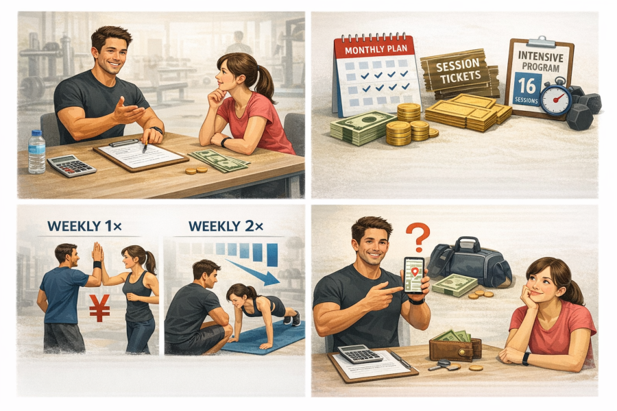 料金体系は主に「月額制」「回数券制」「短期集中コース」「体験セッション」に分かれます。相場としては、月額2〜4万円台、16回前後の短期集中プランで15〜25万円程度がひとつの目安と言われています。まずは体験から試せるジムも多く、雰囲気を確かめてから決める流れが増えているようです。