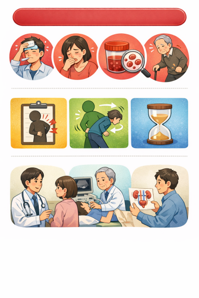 右脇腹痛みに加えて発熱や吐き気がある場合、内臓の炎症などが関係している可能性があると言われています。また、血尿が見られるときは尿路のトラブルが背景にあるケースも紹介されています。