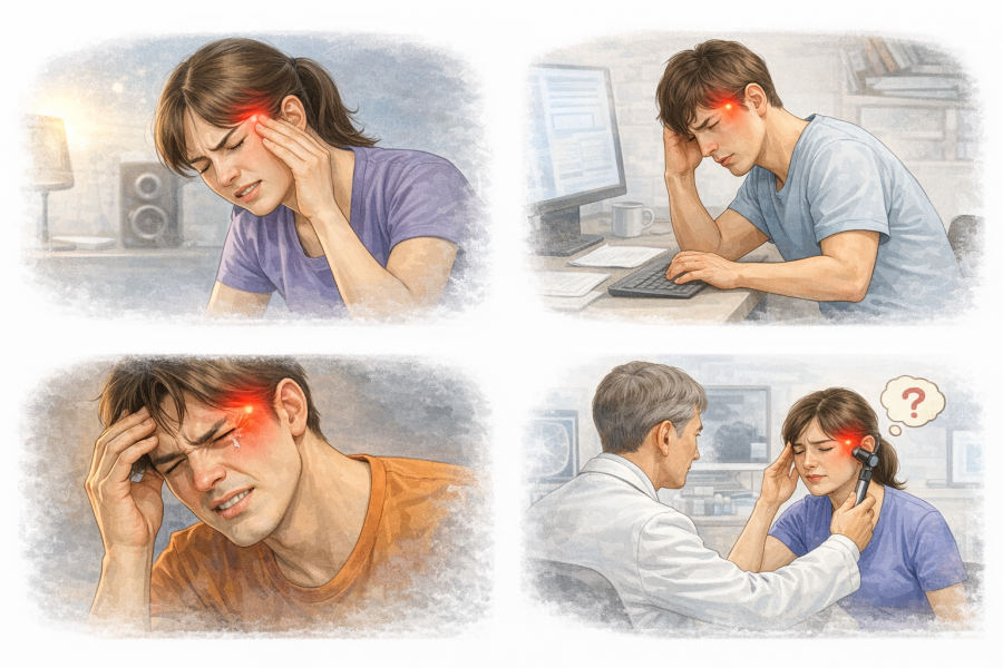 目の奥からこめかみにかけて、キリキリ、ズキンと刺すような強い痛みが出る場合は、群発頭痛の可能性があるとされています。一定時間ごとに繰り返し起こる傾向があり、涙や鼻水を伴うこともあるのが特徴です。じっとしていられないほどの強さになることもあるため、いつもと違う痛みを感じたら早めの来院がすすめられています。