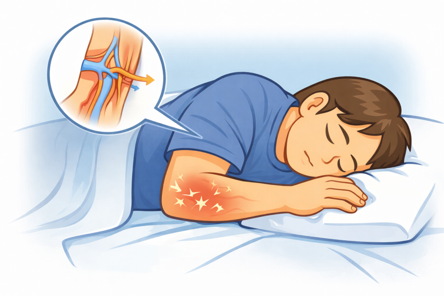 寝ているあいだに腕を体の下に敷いていたり、同じ向きで長時間固定されたりすると、血流や神経が軽く圧迫される場合があるとされています。これは正座のあとに足がジンジンするのと似た原理だと言われています。