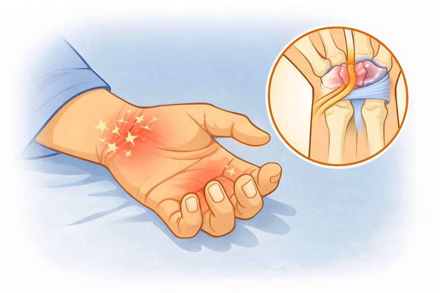 「親指から中指だけピリピリする」「夜間や明け方に強くなる」といった訴えが多いと言われています。スマホやパソコン作業が長い人、手をよく使う仕事の人に見られやすいとも紹介されています。手を振ると少し楽になる、という特徴も参考になるようです。