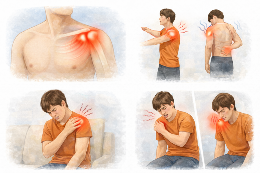 「服を着替える動作がつらい」「夜中にズキズキして目が覚める」といった声もよく聞かれます。前側に痛みが出るケースもあり、肩の付け根がピンポイントで違和感を覚える方も少なくないようです。