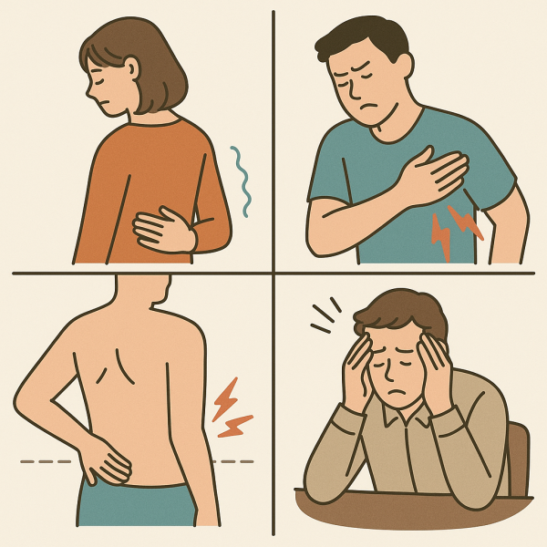 • 背中の左右や上下で痛む位置が偏っている → 内臓疾患(肝臓・胆嚢・腎臓・膵臓など)の可能性あり