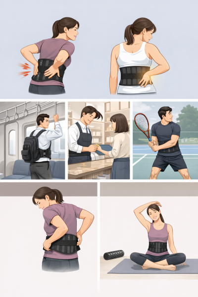 通勤時の満員電車や長時間の立ち仕事、重い荷物を持つ作業前など、腰に負担が集中しやすい場面での使用が一つの目安とされています。