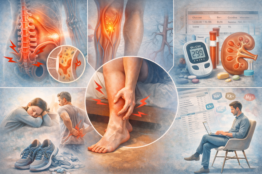 足のつりは、糖代謝や腎機能、電解質バランスの乱れと関連が指摘されるケースもあります。体内のミネラルバランスが崩れることで、筋肉の収縮と弛緩がうまく調整できなくなり、症状として現れる可能性があると言われています。