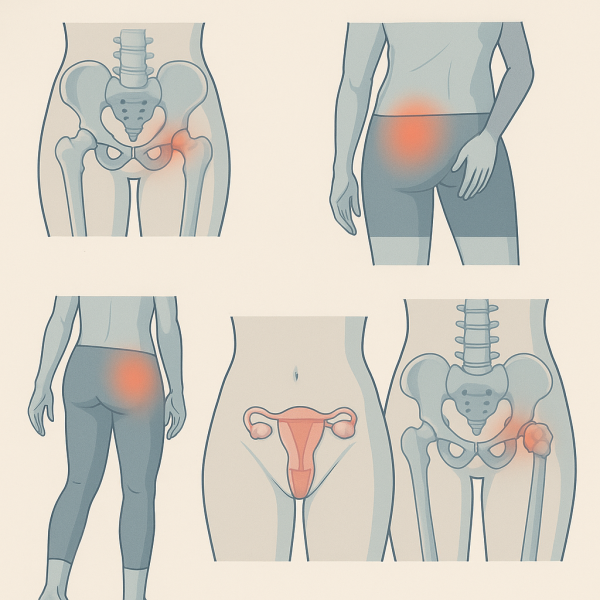 女性の場合、子宮や卵巣の疾患が股関節や鼠径部の痛みに影響することもあると言われています。子宮内膜症や卵巣のう腫は骨盤内で炎症や圧迫を起こし、付け根の違和感として現れることがあります。また、骨粗鬆症による骨折は女性に多く、片側だけの痛みの原因になることがあるとされています。