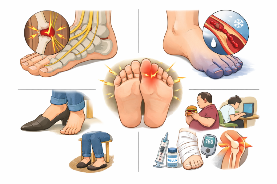そんな疑問を持つ方は少なくありません。足の指のしびれは、ひとつの理由だけでなく、神経・血流・生活習慣など複数の要素が重なって起こることがあると言われています。とくに中指や薬指は足裏の神経が集中する場所でもあり、負担のかかり方によって違和感が出やすいと考えられています。ここでは代表的な原因を整理しながら見ていきましょう。