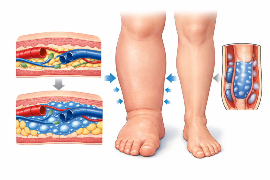 • 足が腫れたように見える状態で、むくみの仕組み(液体がたまる病態)を解説