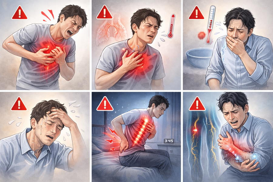 冷や汗が出たり、痛みが背中から胸や腕へ広がるように感じる場合も注意したいポイントと言われています。違和感の範囲を把握しておくことが役立ちます。